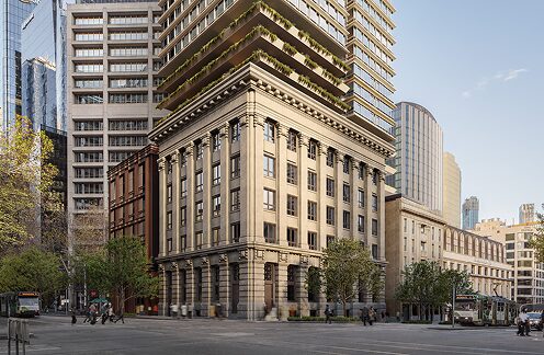1924年築の歴史的建造物 State Savings Bank と Batman’s Hill Hotel を活用し、過去の遺産と現代建築を融合させたブティック・アパートメント開発です。設計を担当するのは、数々の受賞歴を誇るPlus Studio。重厚なヘリテージ・ファサードを生かしながら、その上に新たなタワーを築き上げます。